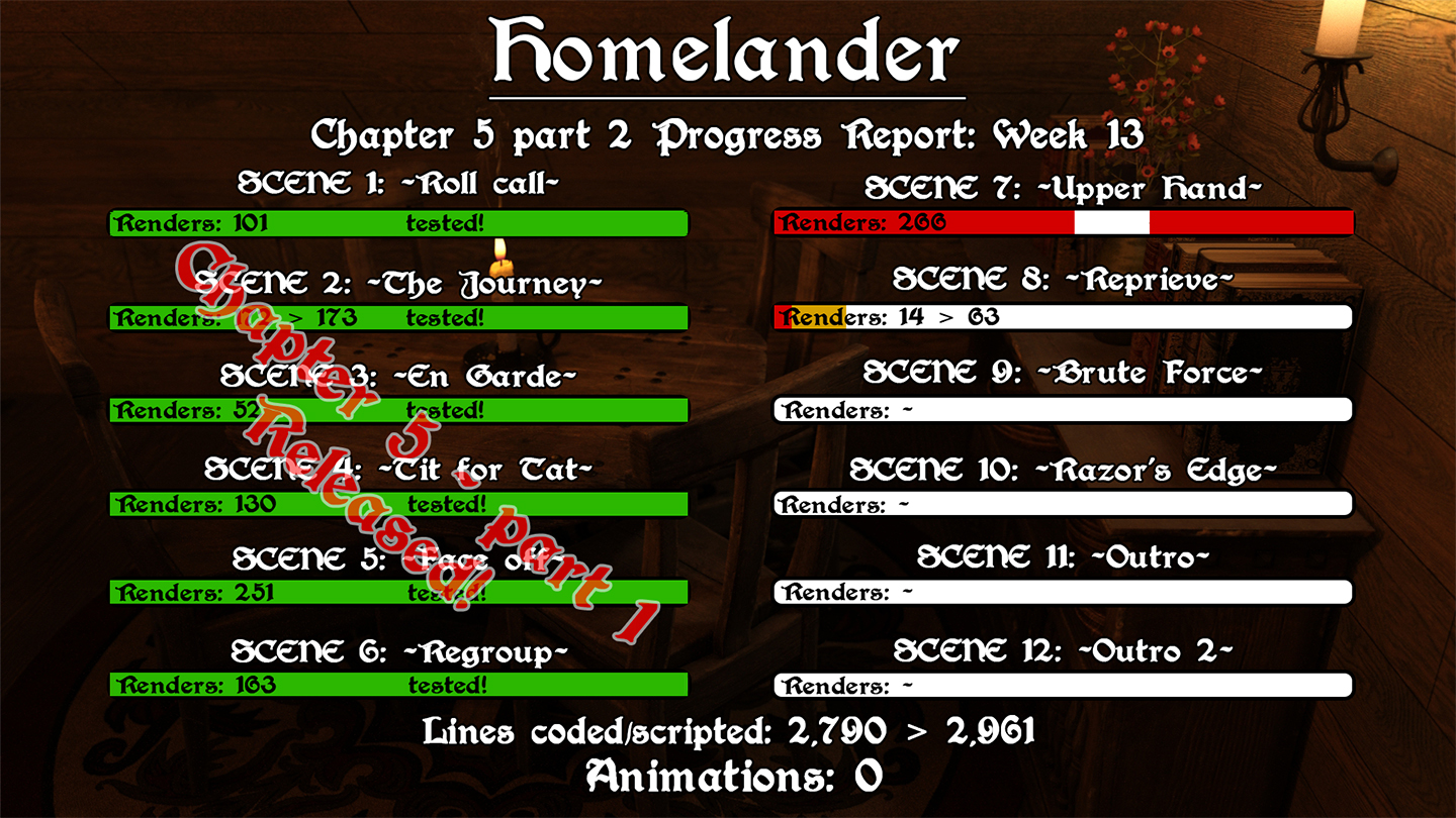 As I briefly mentioned last week, I broke S8 down into 5 smaller and easier-to-manage sections. So far, 3 of those scenes have already been built, and I've started rendering and finalizing the script for 2 of them. Usually, I would only work on one thing at a time, but I've reached a crossroads with one of the scenes and moved on to give myself more time to consider my options. I may have to post a subscriber poll this week to get help deciding, but we'll see... I'll only hint that it has something to do with a potential 'variety' path scene.